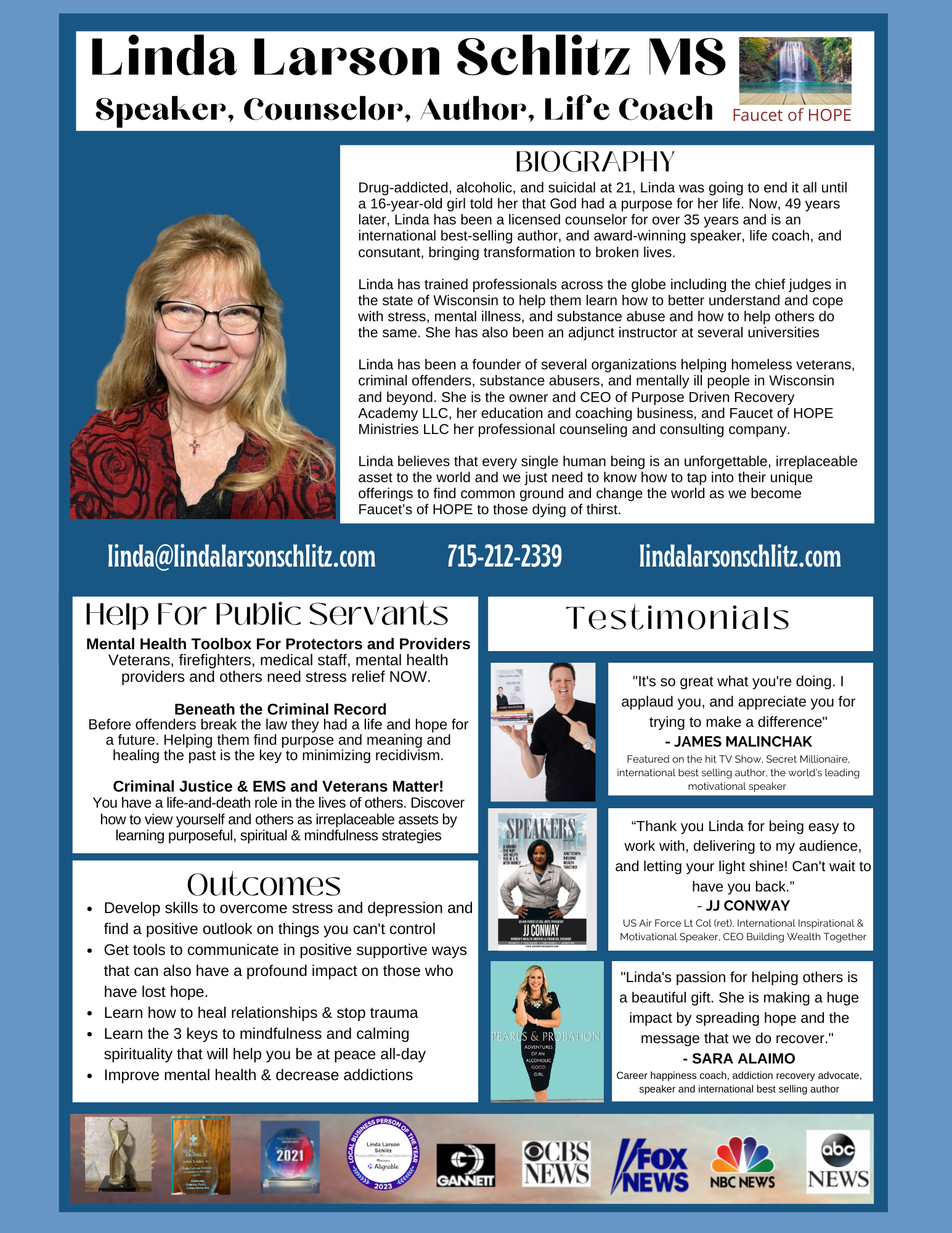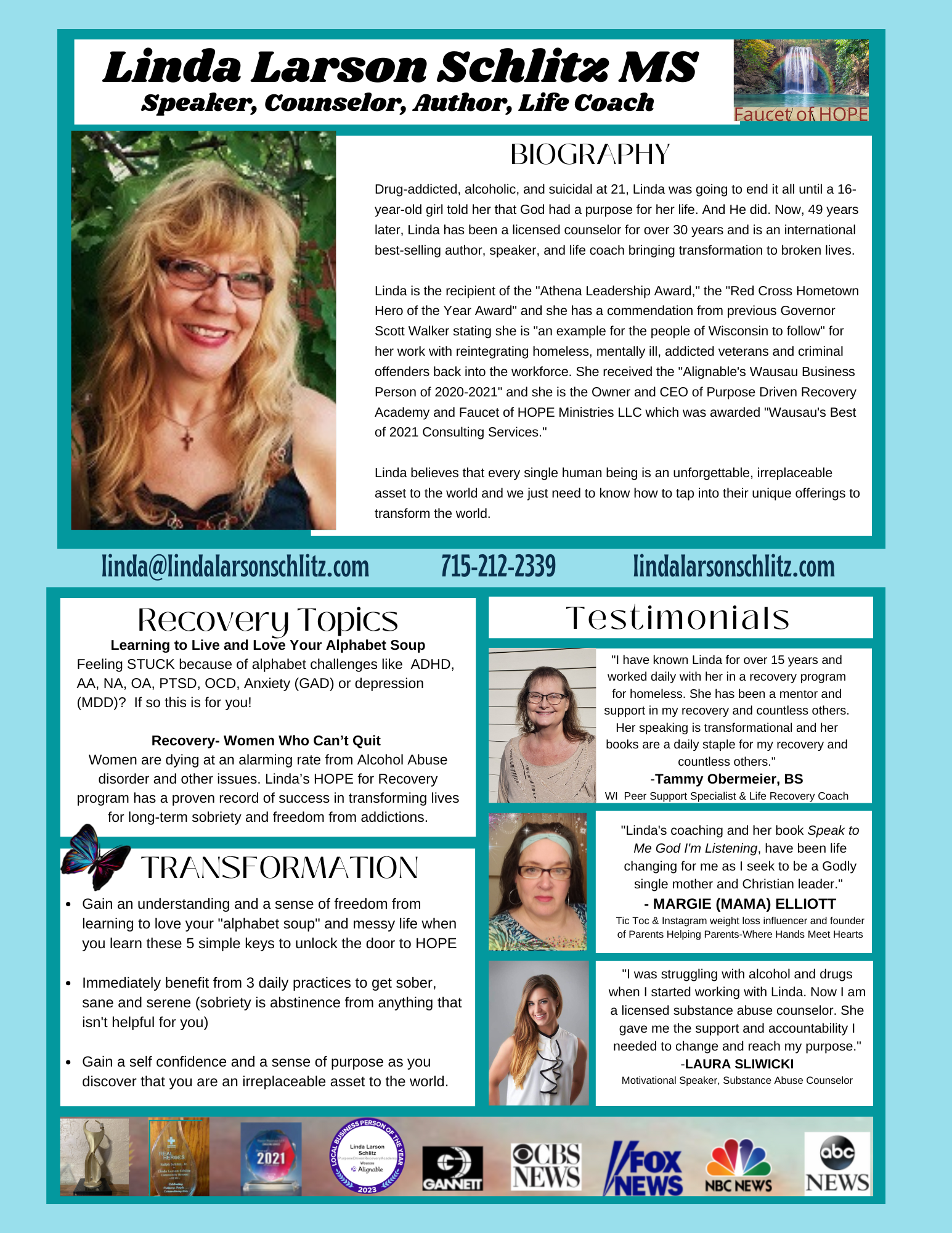 Following are Linda’s speaker sheets for the various groups she serves and some of her media appearances. If you would like to interview Linda or schedule her to speak at your event you can text her at 715-212-2339 to set up a time to chat.